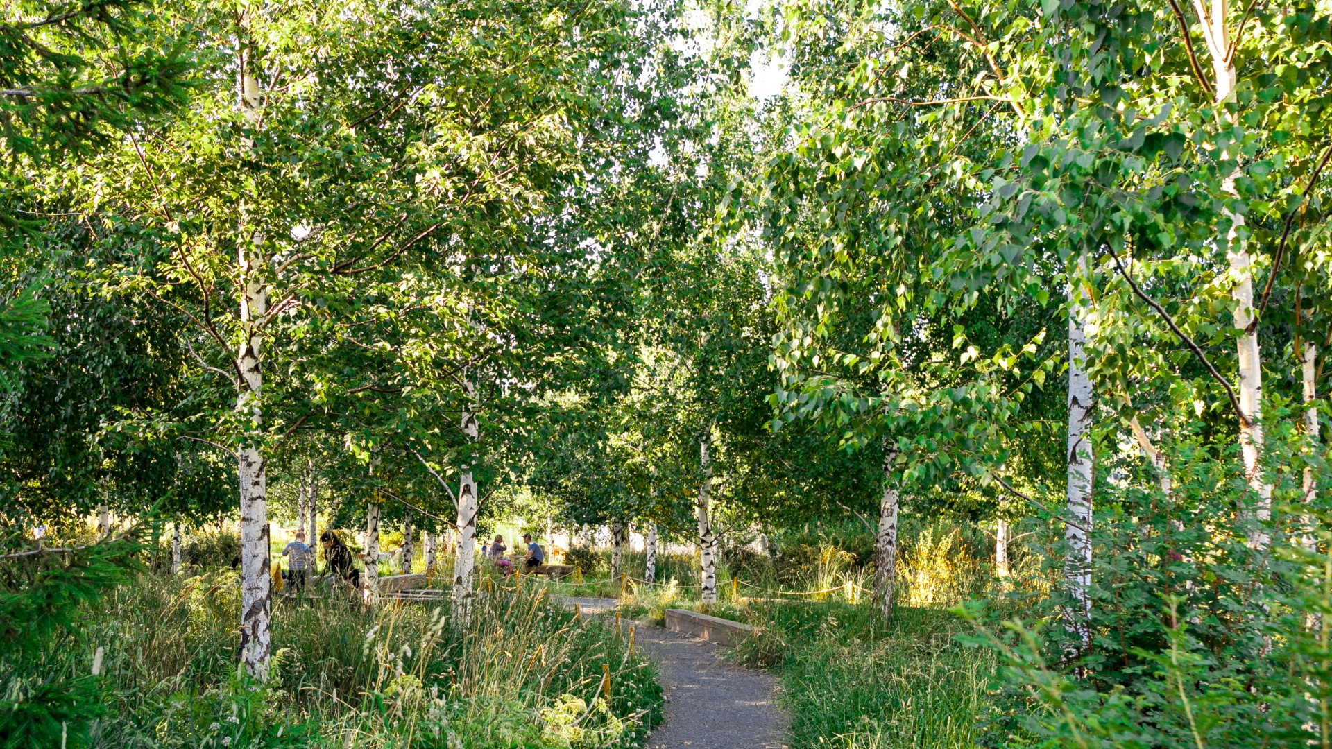 At the entrance to the Park from the side of the Red Square is a birch grove. Its ground cover is made up of wild thyme, northern hawkweed and other herbs. Through the birches (one of the symbols of Russia), you can see the Red Square, St. Basil's Cathedral, and the Kremlin. In nature, birch forest is an intermediate type of forest, under its canopy of broad leaves spruce trees develop, and in the long run the birch forest always turns into a spruce one. Therefore, in "Zaryadye" the birch grove borders with the coniferous forest, which reproduces the natural order of things. The change of one type of vegetation to another in botany is called "succession"; this phenomenon is clearly represented on the boundary of the birch grove and the Great meadow.